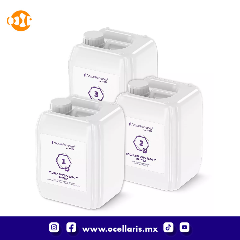 Dosis: Todos los fluidos deben dosificarse por igual en base al consumo de Ca, KH y Mg. Analice regularmente su agua y establezca la dosis óptima en función de los resultados del análisis. Con un stock medio de corales SPS, la dosis recomendada de Components Pro es de 12 ml por cada 100 litros de agua al día. Cuando los parámetros del agua no estén en el rango recomendado, use uno de los aditivos de Aquaforest Lab (Ca Plus, Mg Plus, KH Plus) hasta alcanzar los niveles deseados.