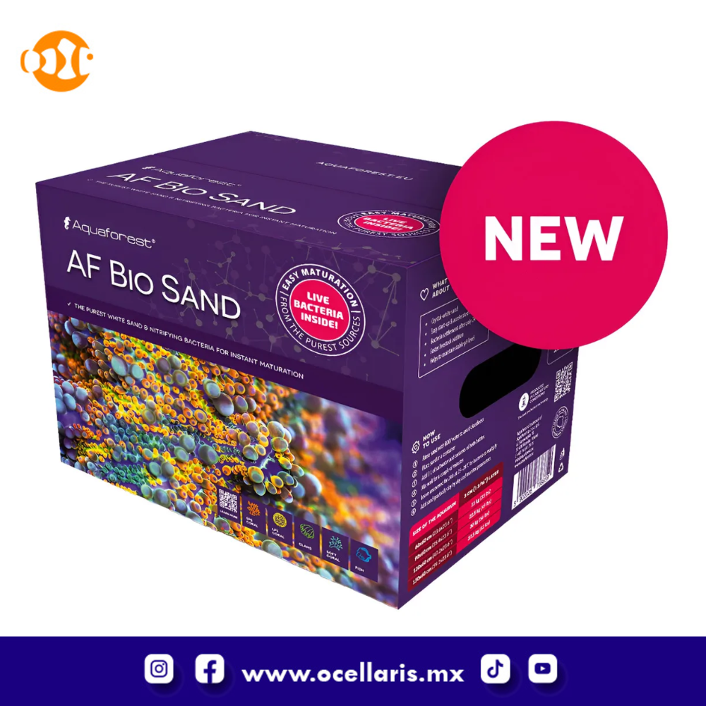 Está libre de contaminantes y su contenido de carbonato de calcio ayuda a estabilizar la composición química del agua. La tecnología de vanguardia de AF Bio Sand acelera significativamente el proceso de maduración de un acuario y permite una incorporación más rápida de animales a un tanque recién instalado. Las botellas incluidas contienen cepas de bacterias nitrificantes aisladas en laboratorio y un alimento que facilita su desarrollo y multiplicación.