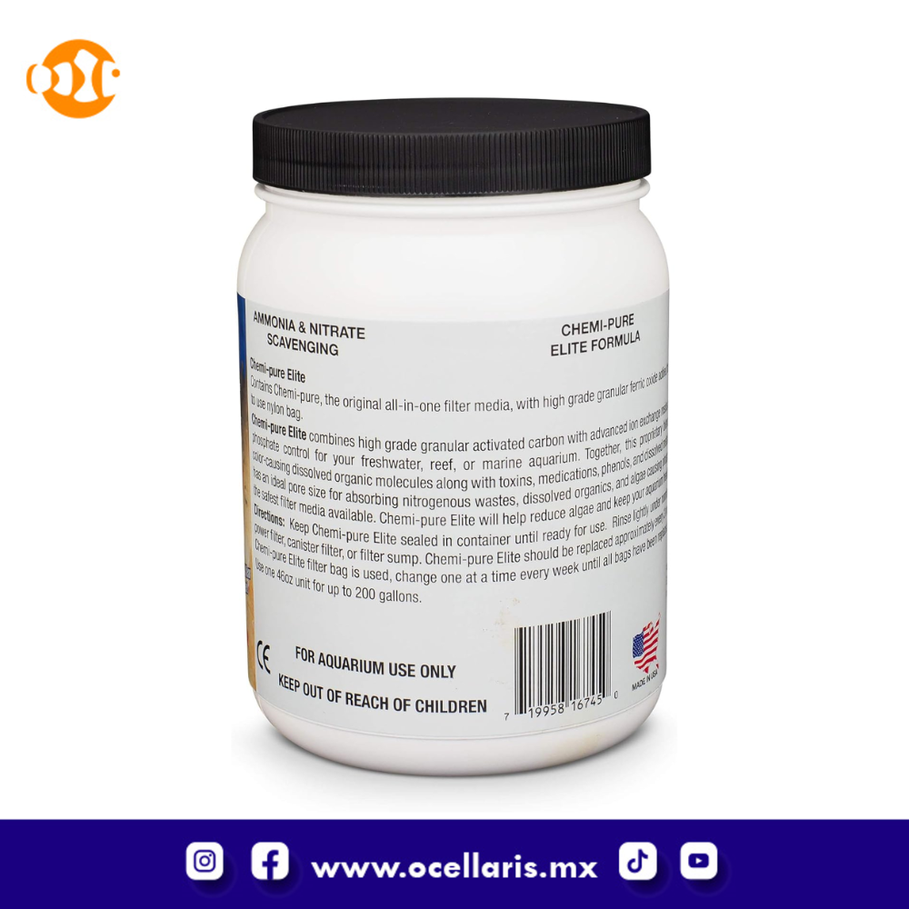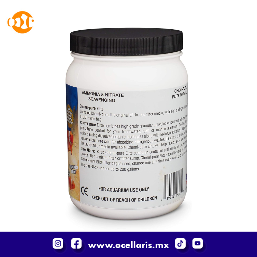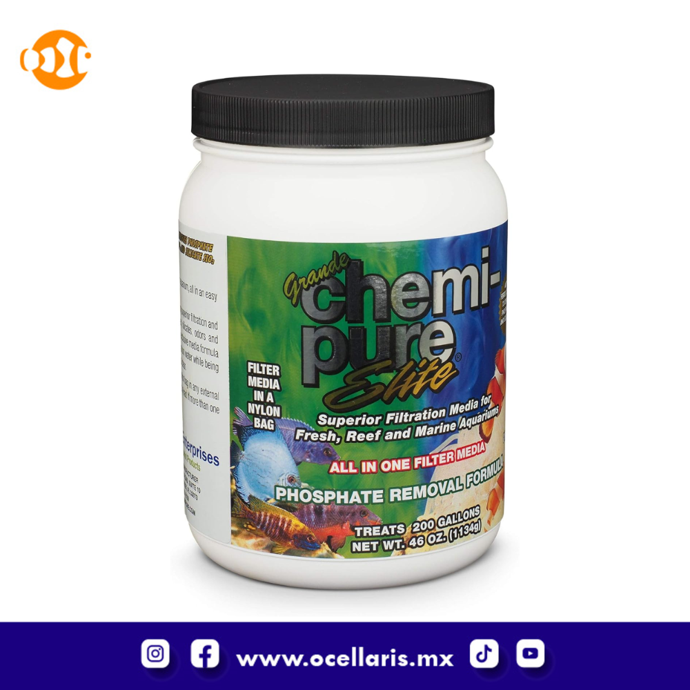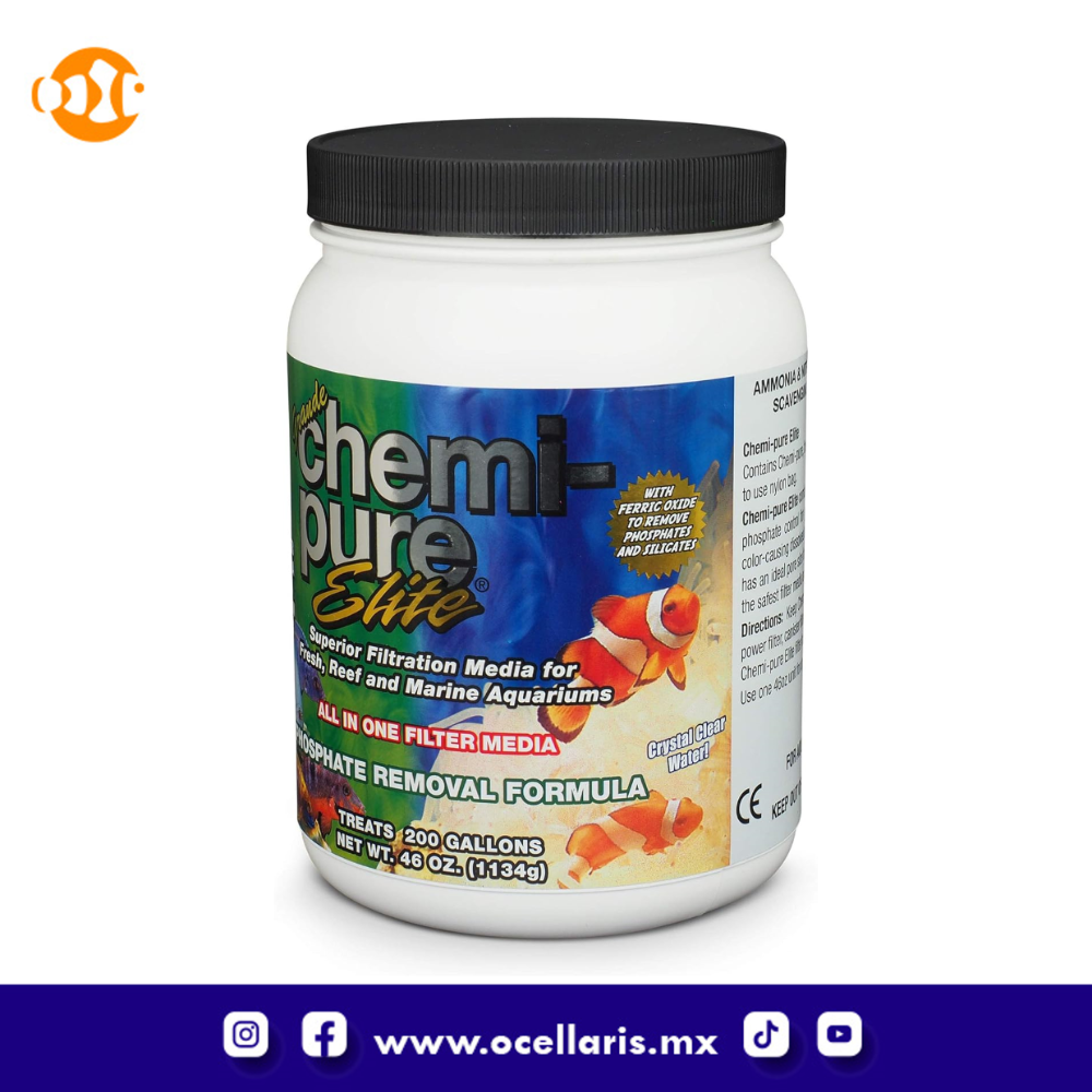 Chemi-pure Elite contiene GFO (óxido férrico granular) para eliminar fosfatos y silicatos del cuerpo de agua del acuario. Se ha demostrado que GFO es una de las mejores opciones para eliminar y controlar los niveles de fosfato y/o silicato dentro de su acuario.