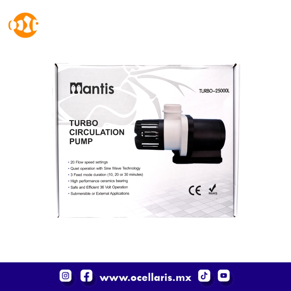 La bomba de retorno Mantis TURBO 25000 es un accesorio de alta calidad y rendimiento diseñado para mantener un flujo constante de agua en tu acuario. Con una capacidad de 25,000 l/h, esta bomba garantiza una circulación eficiente y una oxigenación adecuada para tus peces y corales.